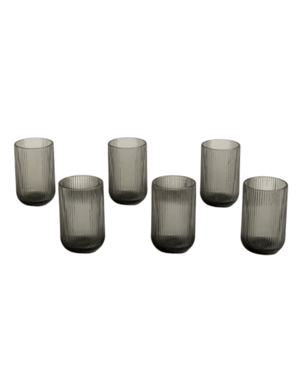 Set de vasos altos de vidrio prensado color fume, con diseño de rayas verticales.