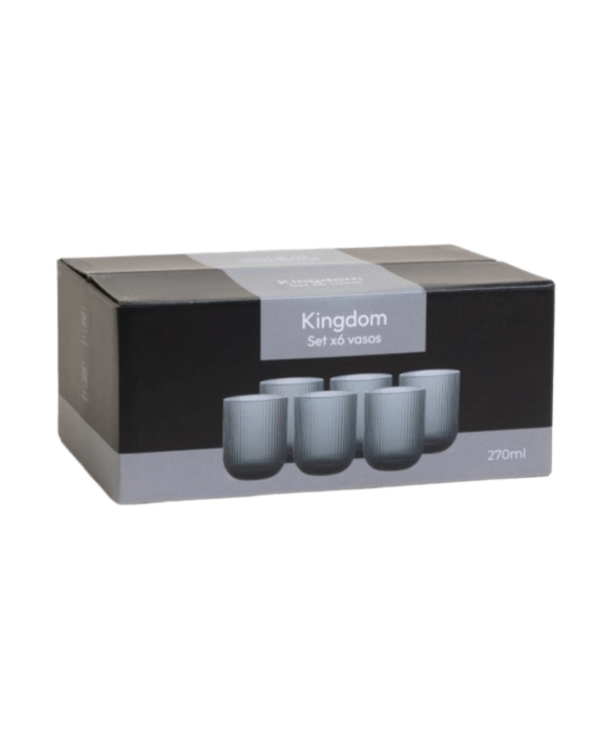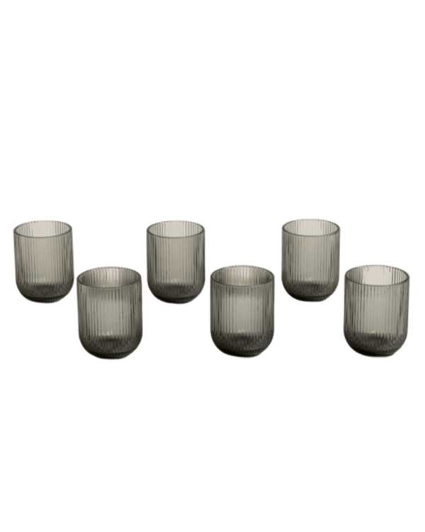 Set de vasos bajos de vidrio prensado color fume, con diseño de rayas verticales.