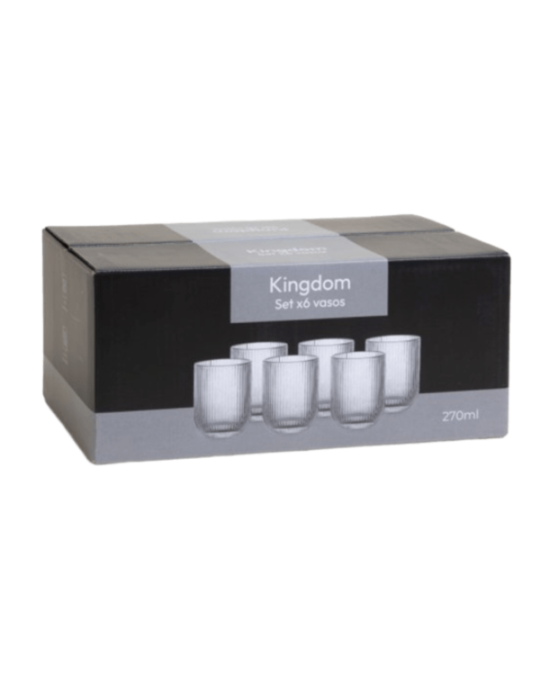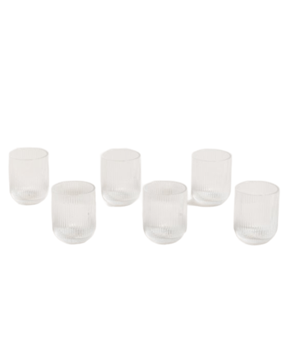 Set de vasos bajos de vidrio prensado con diseño de rayas verticales.
