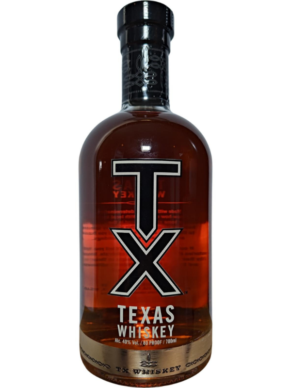 TX Texas Whiskey es un bourbon artesanal de Texas, EE. UU., elaborado con maíz, cebada y trigo 100% texanos, madurado en roble blanco para un sabor complejo a caramelo, vainilla y especias, destacando por su suavidad, notas ricas y un final con canela y pimienta, ideal para beber solo o en cócteles, y reconocido por su botella única con detalles de cuero que evocan la cultura vaquera